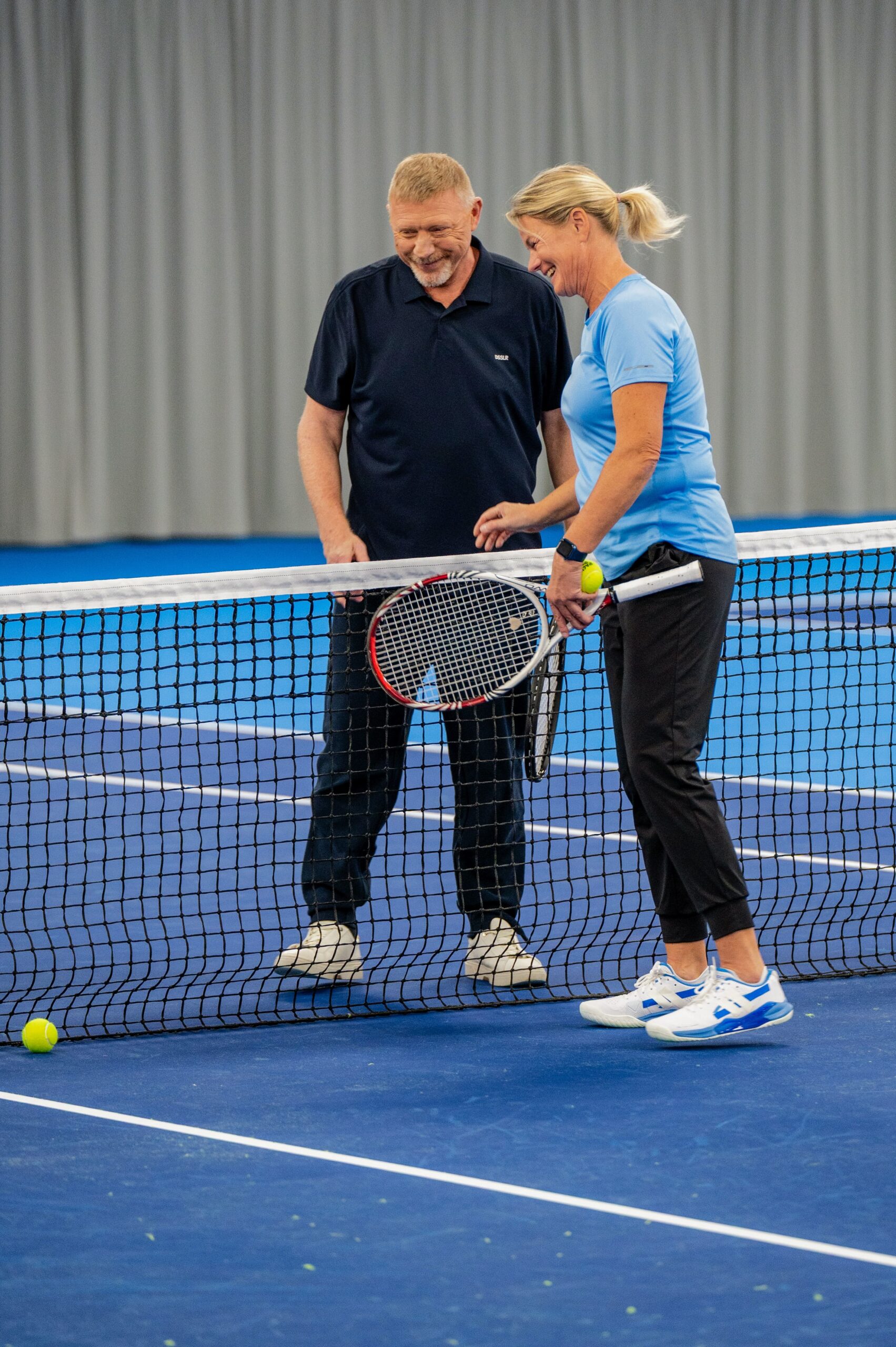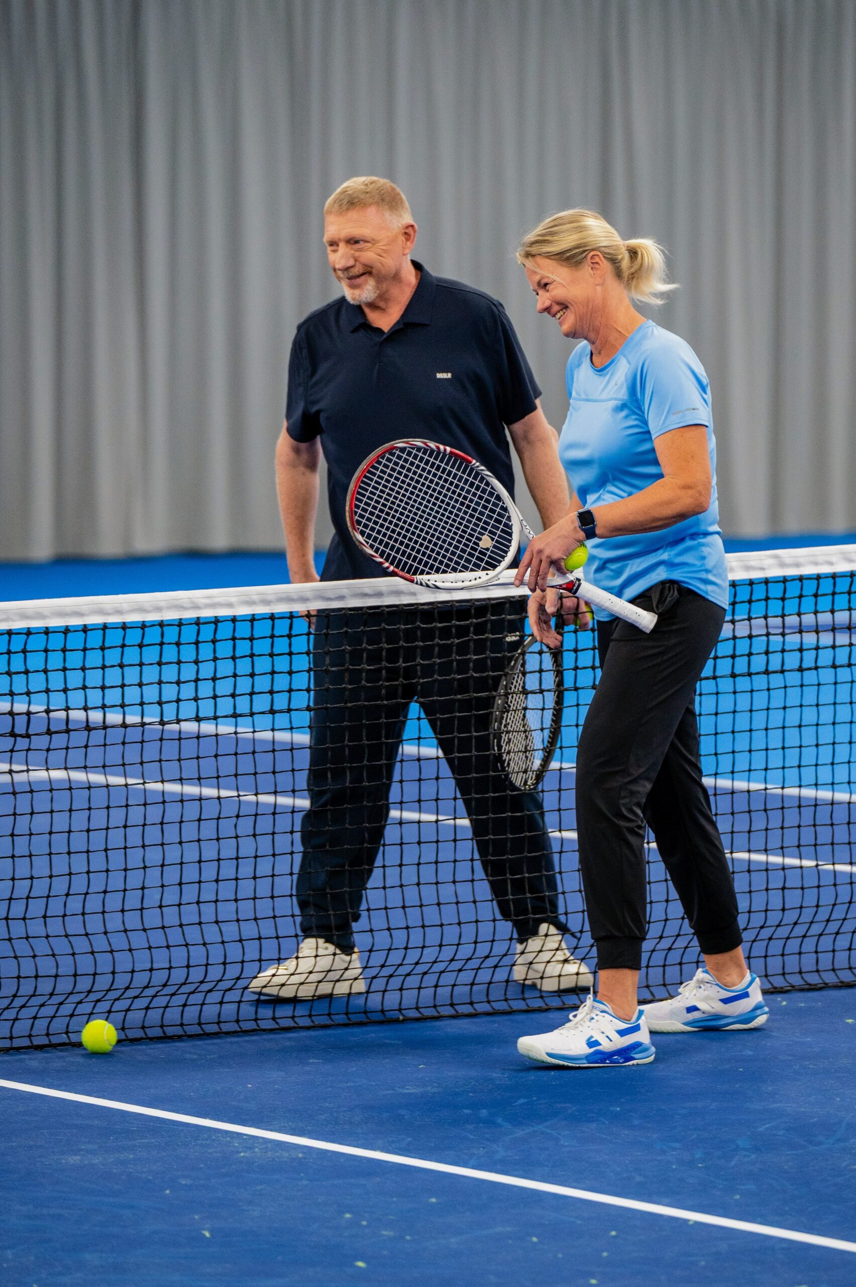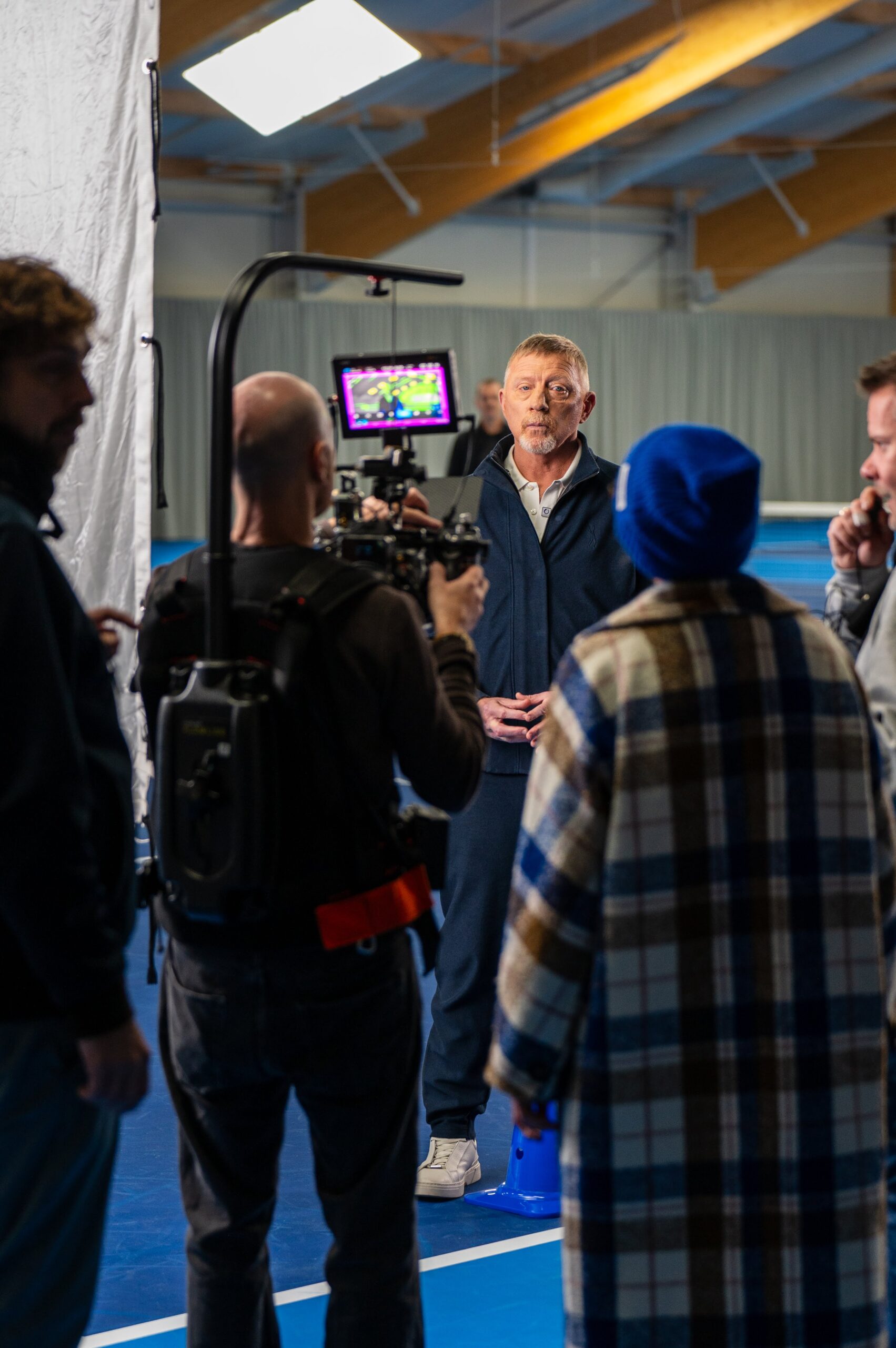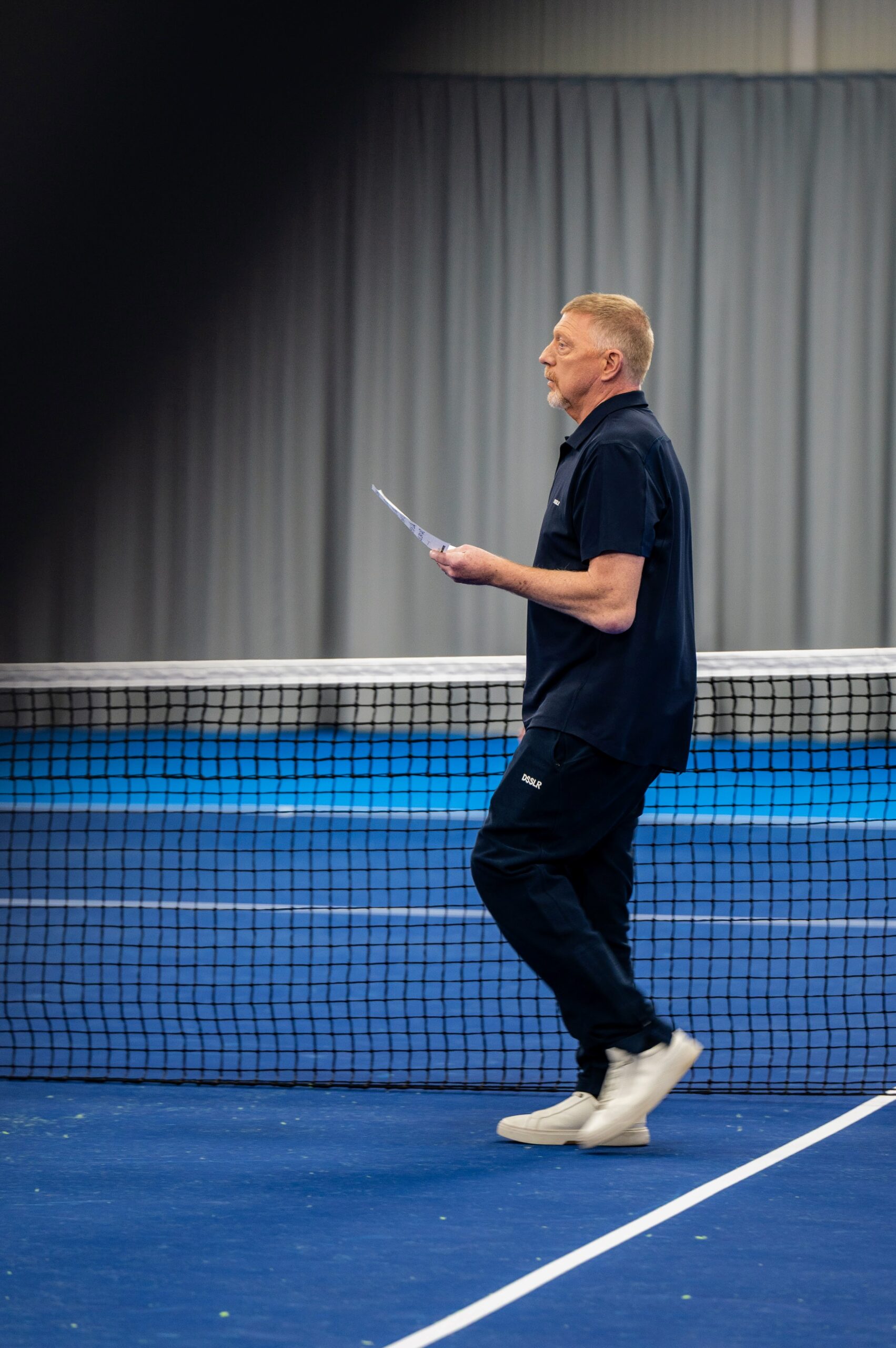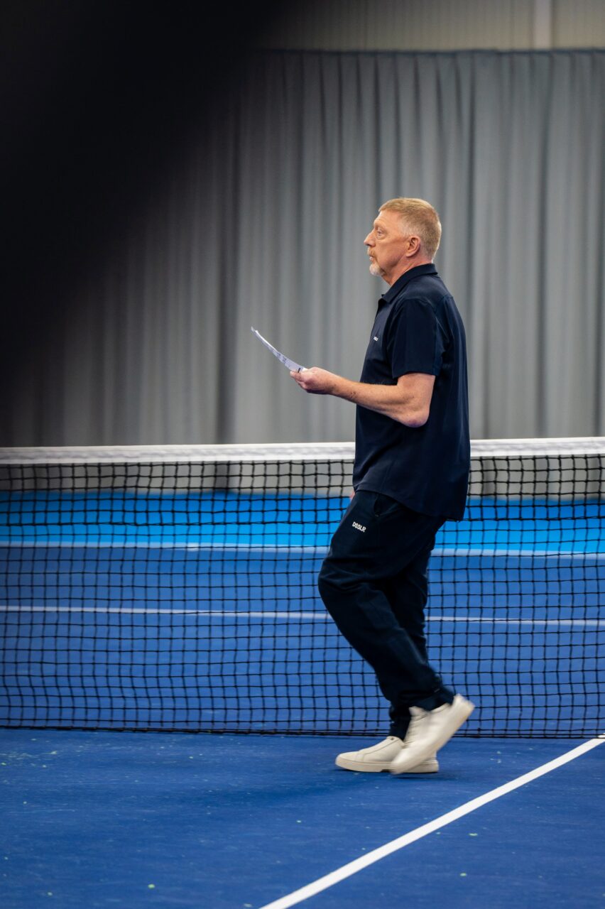 On court, Becker drifts into the director’s role almost naturally. He positions the camera, adjusts the progress of the shot. After ten minutes, he announces: “So, that’s it, right?” When I take the group photo at the end — crew members and club officials at the net — he is already signaling me to hurry before everyone has even gathered.