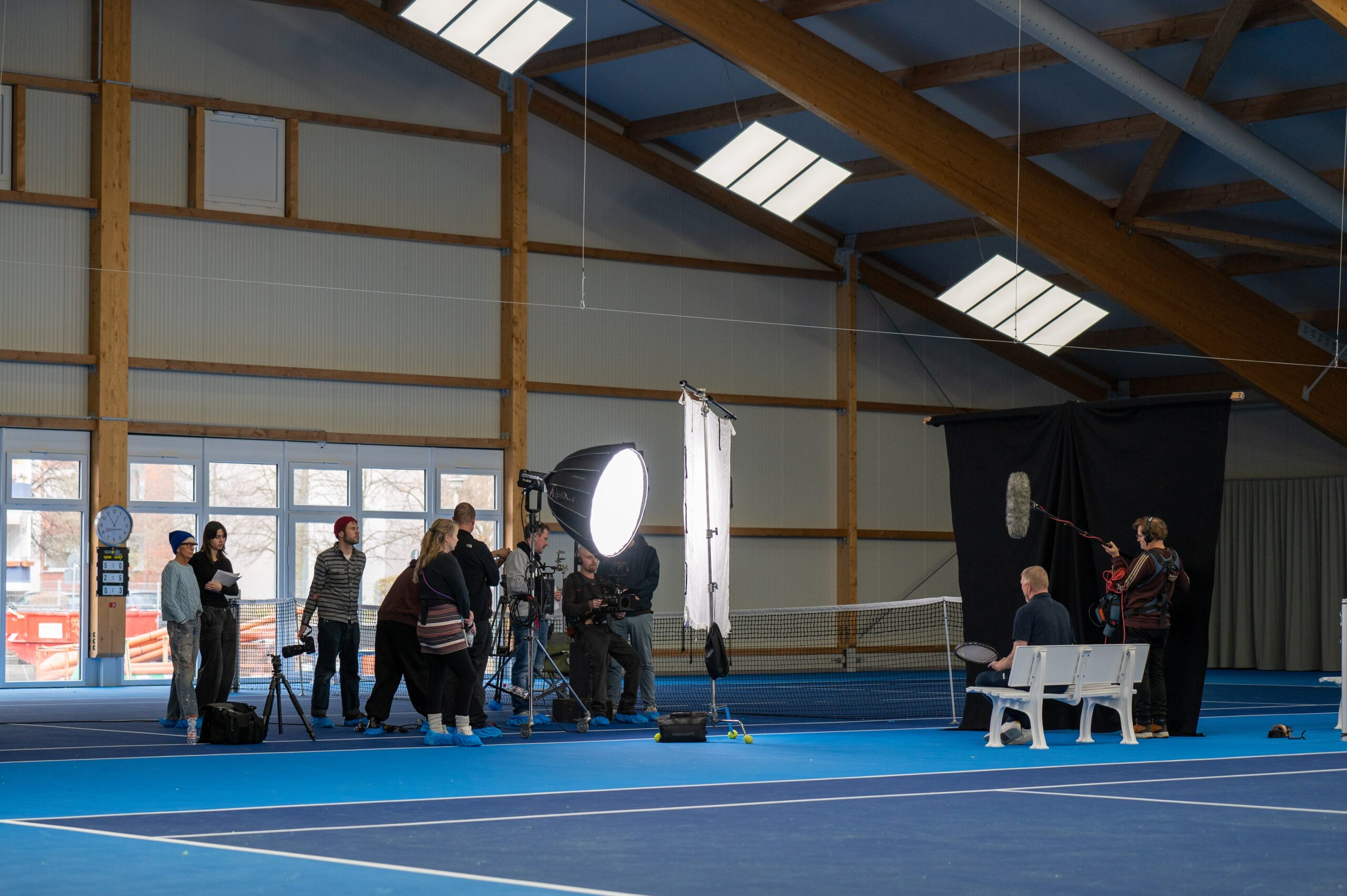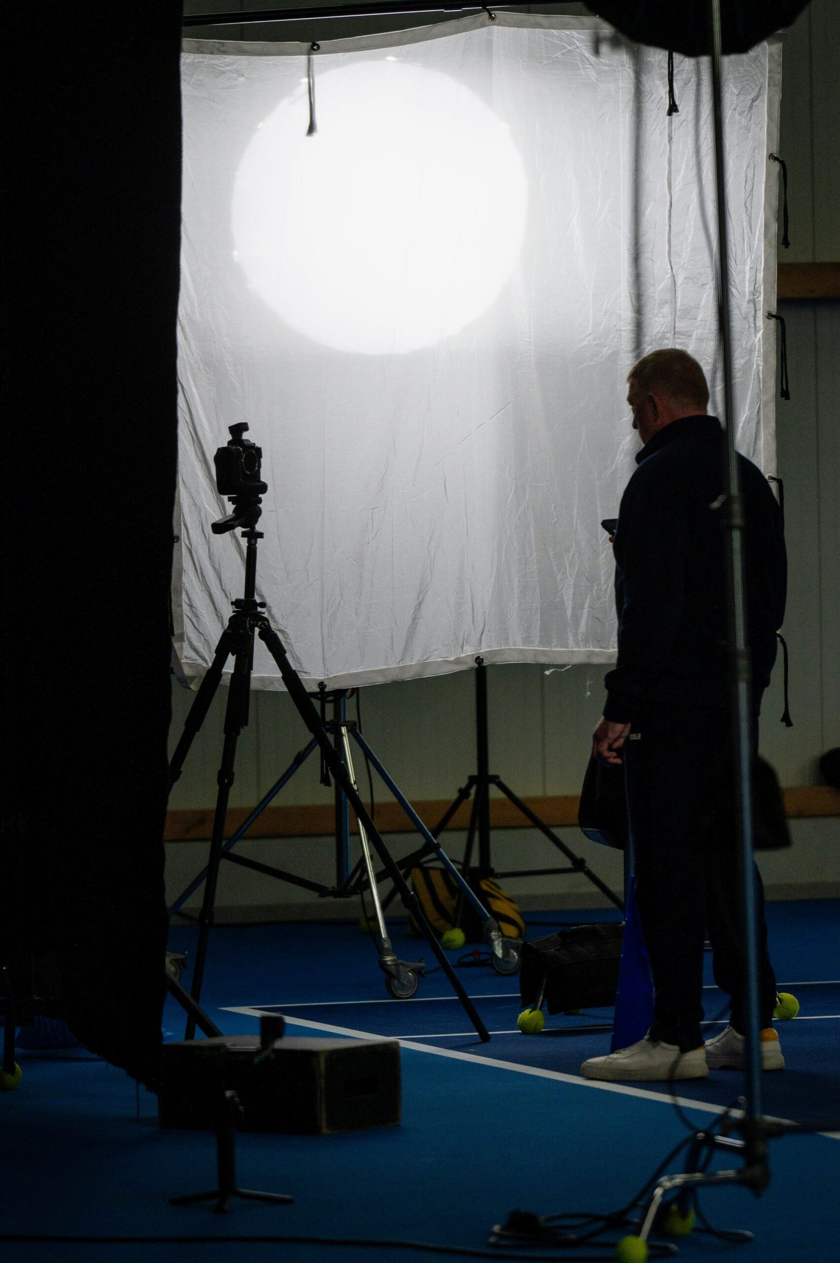 At the entrance, cases, tables, and lighting crates were already stacked. On Court 11 — the one facing Court 8 — the miniature set was ready: two giant lamps, a few umbrellas, cameras on tripods. Not much scenery required. After all, today, we are the scenery.