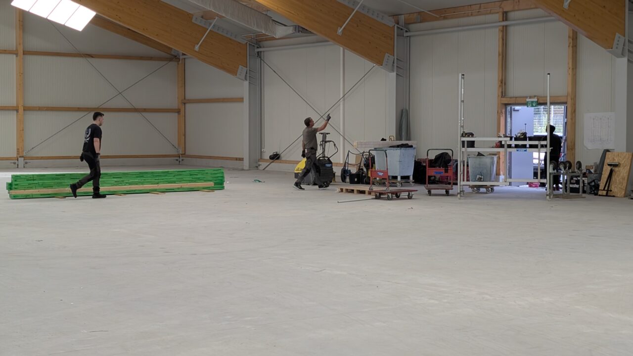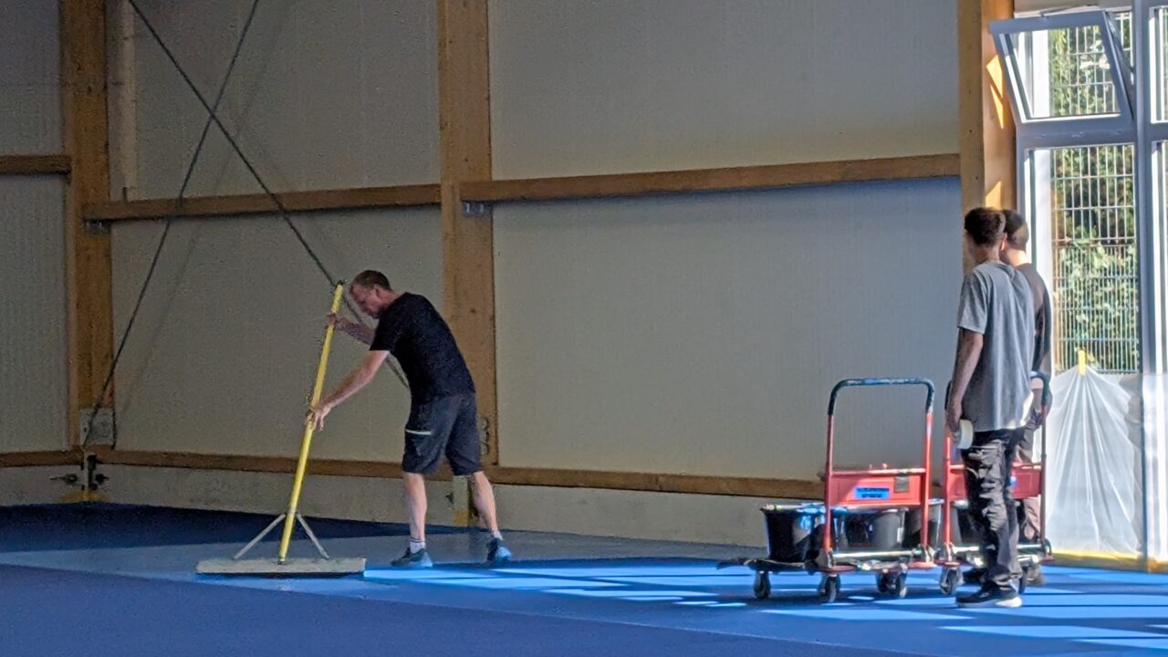 Es war ein nahtloser, fast perfekter Übergang. Unser Sportbodenbauer nahm seine Arbeit auf, da waren die Elektriker noch mit den letzten Feinarbeiten beschäftigt. Besser hätte man nicht planen können. Unseren Boden baut die Firma Allwetter Sportbeläge GmbH aus Stuttgart. Natürlich hört man es. Und man merkt es. Die Jungs, sobald sie auf der Bildfläche oder korrekt gesagt, in unserer Halle, auftauchten, geben richtig Gas. „Schaffe, schaffe, Plätzle baue“ heißt es ja auch in einer schwäbischen Volksweise.