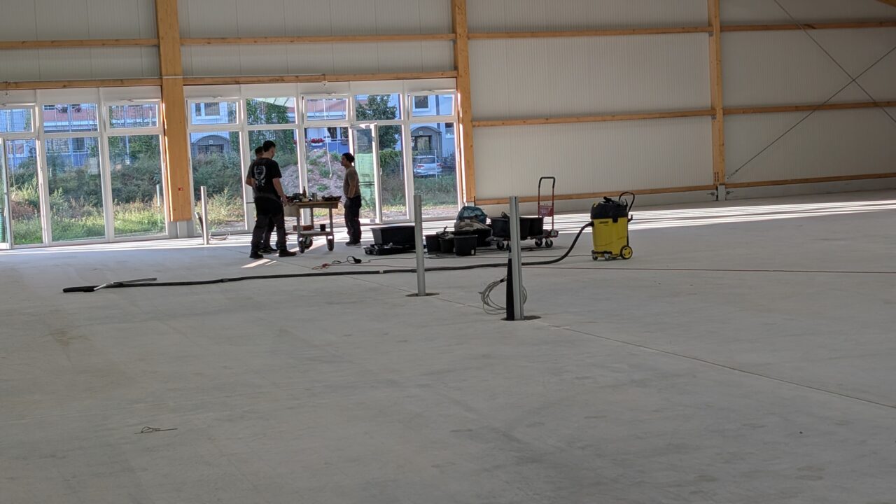 Um dann unseren Sportboden verlegen zu können, musste der komplette Betonboden nun blitzeblank gereinigt werden. Dazu wurde die Bodenplatte abgesaugt. Dann wurde der Boden mit einer Maschine nochmals geschliffen. Anschließend wurde wieder gesaugt. Das Szenario wiederholte sich mehrfach, bis unser Beton den Grip bzw. die Oberflächenstruktur aufwies, die für unsere künftigen Hardcourts benötigt wird.