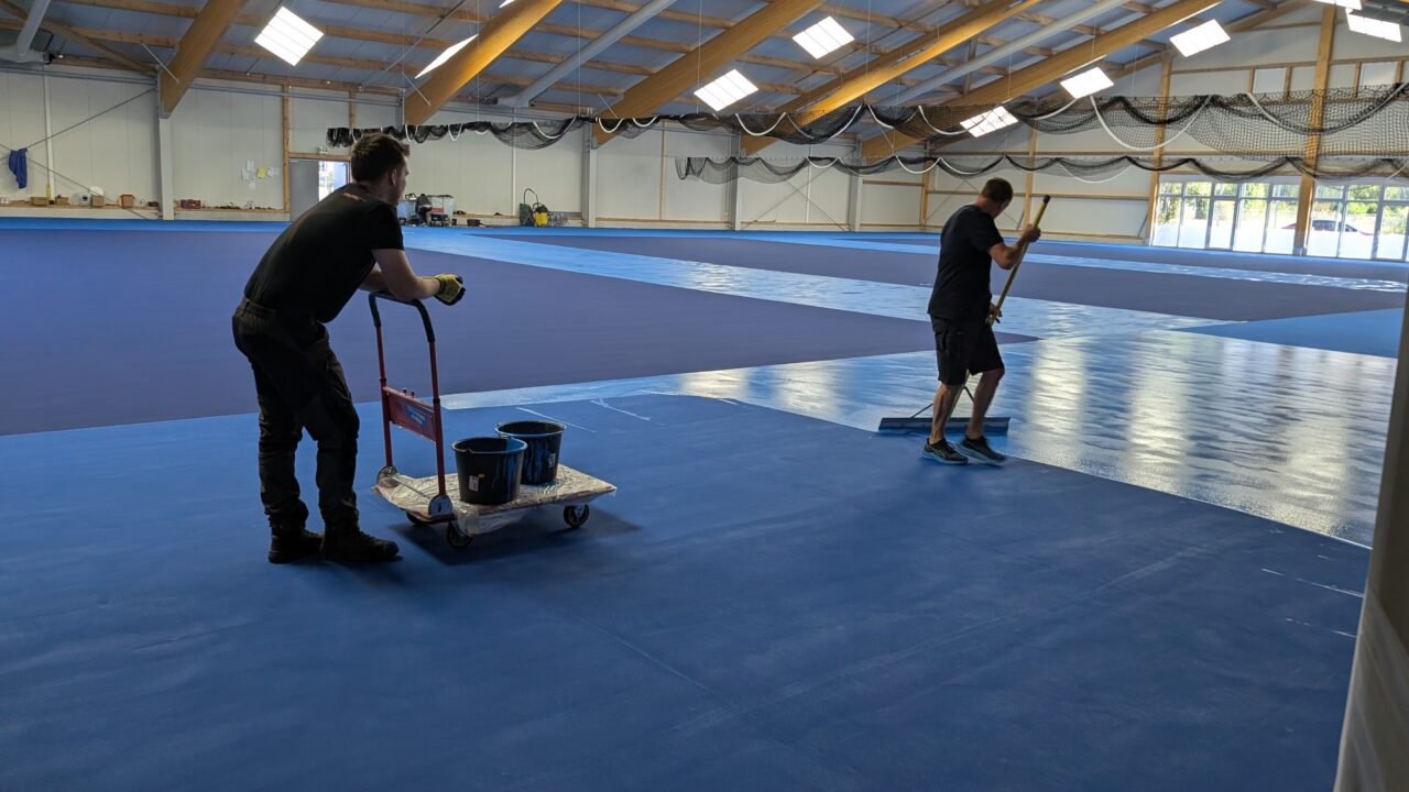 Damit verabschiedeten sich die fleißigen Mitarbeiter von Allwetter Sportbeläge GmbH. Sie haben in einer kurzen Zeit mit drei Leuten großartiges geleistet und dieser Halle das Aussehen gegeben, das sie nun für eine hoffentlich lange Zukunft behalten wird.