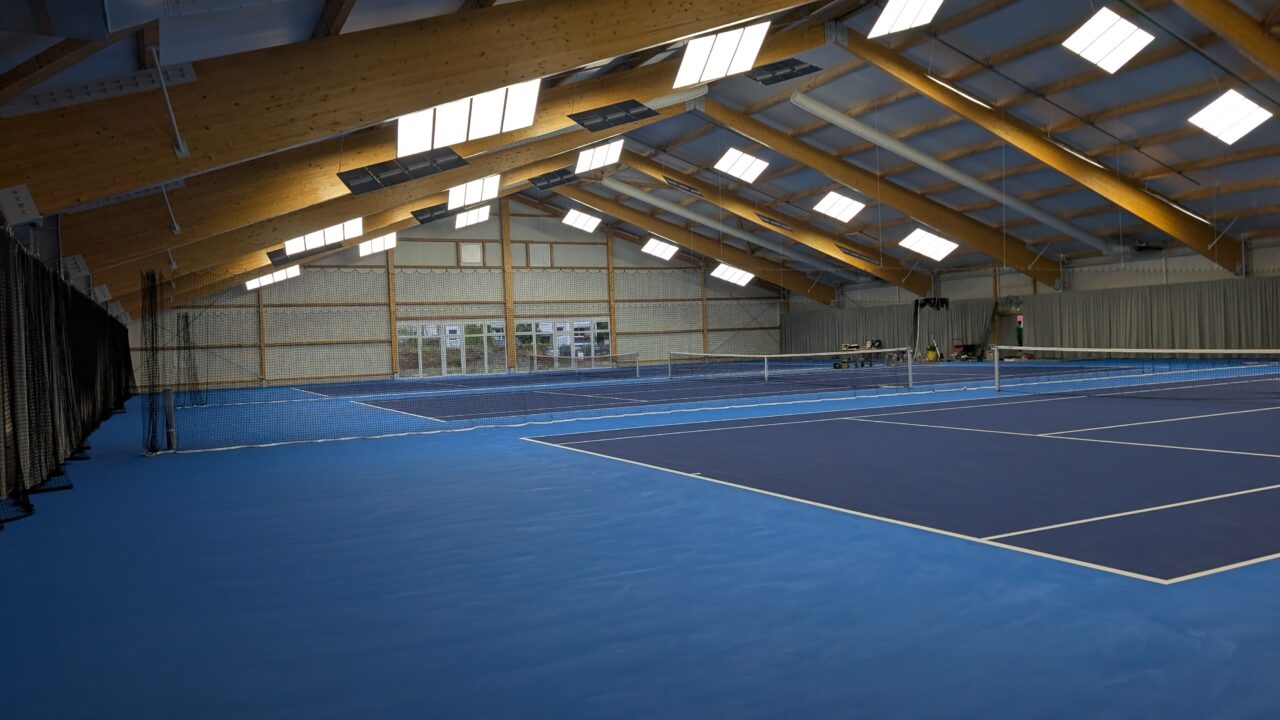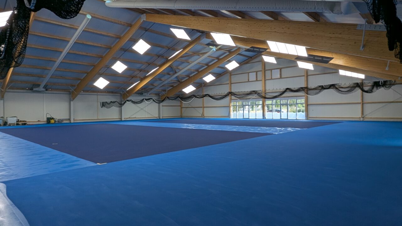 Nachdem auch diese Arbeiten erledigt waren, wurden die Linien auf die Courts aufgebracht, Sockelleisten rund herum sowie ein Übergangsprofil zwischen Courts und Gang montiert. Zum Schluss folgte die Ballfanggardine auf der anderen Seite sowie der Einbau der Netzpfosten und Netze. Und so et voila wurde nach knapp drei Wochen aus einem Betonboden drei Tenniscourts.